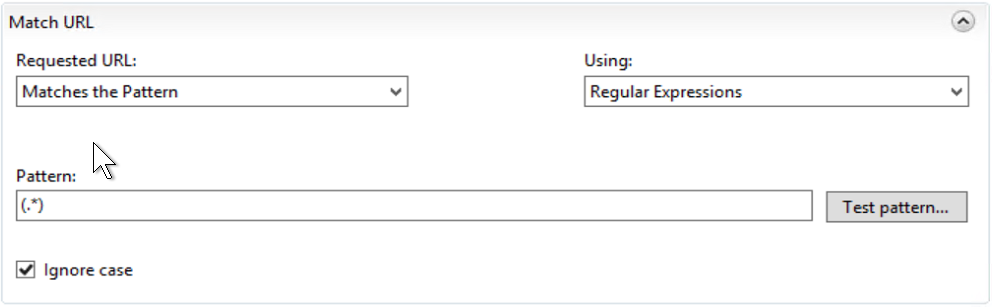 Once URL Rewrite screen is open, click the "Add Rules..." link in the right hand pane and enter the details as shown below.