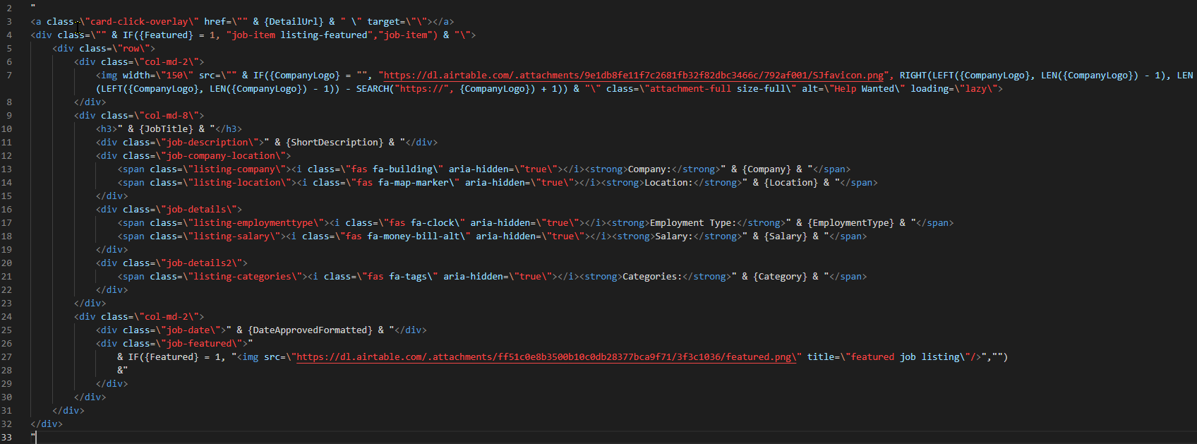 "<a class=\"card-click-overlay\" href=\"" & {DetailUrl} & " \" target=\"\"></a><div class=\"" & IF({Featured} = 1, "job-item listing-featured","job-item") & "\"> <div class=\"row\"> <div class=\"col-md-2\"> <img width=\"150\" src=\"" & IF({CompanyLogo} = "", "https://dl.airtable.com/.attachments/9e1db8fe11f7c2681fb32f82dbc3466c/792af001/SJfavicon.png", RIGHT(LEFT({CompanyLogo}, LEN({CompanyLogo}) - 1), LEN(LEFT({CompanyLogo}, LEN({CompanyLogo}) - 1)) - SEARCH("https://", {CompanyLogo}) + 1)) & "\" class=\"attachment-full size-full\" alt=\"Help Wanted\" loading=\"lazy\"> </div> <div class=\"col-md-8\"> <h3>" & {JobTitle} & "</h3> <div class=\"job-description\">" & {ShortDescription} & "</div> <div class=\"job-company-location\"> <span class=\"listing-company\"><i class=\"fas fa-building\" aria-hidden=\"true\"></i><strong>Company:</strong>" & {Company} & "</span> <span class=\"listing-location\"><i class=\"fas fa-map-marker\" aria-hidden=\"true\"></i><strong>Location:</strong>" & {Location} & "</span> </div> <div class=\"job-details\"> <span class=\"listing-employmenttype\"><i class=\"fas fa-clock\" aria-hidden=\"true\"></i><strong>Employment Type:</strong>" & {EmploymentType} & "</span> <span class=\"listing-salary\"><i class=\"fas fa-money-bill-alt\" aria-hidden=\"true\"></i><strong>Salary:</strong>" & {Salary} & "</span> </div> <div class=\"job-details2\"> <span class=\"listing-categories\"><i class=\"fas fa-tags\" aria-hidden=\"true\"></i><strong>Categories:</strong>" & {Category} & "</span> </div> </div> <div class=\"col-md-2\"> <div class=\"job-date\">" & {DateApprovedFormatted} & "</div> <div class=\"job-featured\">" & IF({Featured} = 1, "<img src=\"https://dl.airtable.com/.attachments/ff51c0e8b3500b10c0db28377bca9f71/3f3c1036/featured.png\" title=\"featured job listing\"/>","") &" </div> </div> </div></div>"